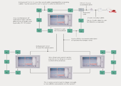 Il s’installe avec un câblage en boucle assurant un fonctionnement en continu même en cas de rupture en un point du système (pour notre option de câblage en étoile, rendez-vous sur notre page dédié au système Care2). Il est possible de connecter de 4 à 127 centrales pouvant communiquer avec tous les interphones branchés sur le système.